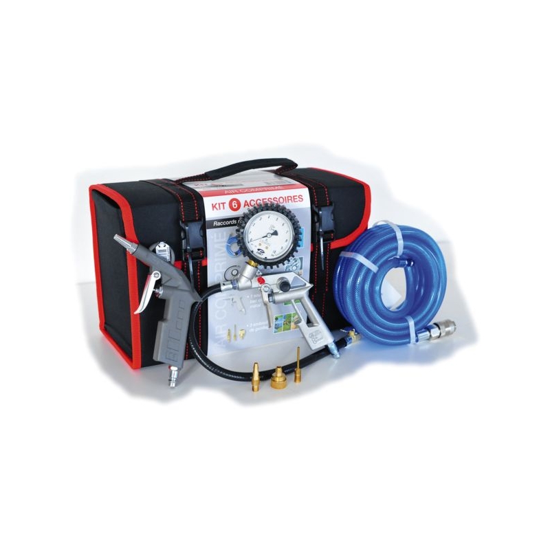 Composé de : - 1 tuyau de 5 m - 1 poignée de gonflage homologuée CE - 1 soufflette bec court métal - 3 embouts de gonflage - 1 valise nylon L 35 x H 21 x P 18 cm