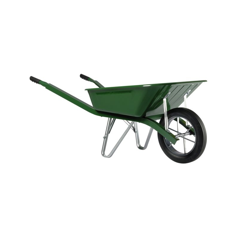 Pour tous les travaux lourds et intensifs. Caisse peinte verte 90 L, épaisseur 1 mm. Brancard cornières soudées 40 x 40 x 4 mm peint, pieds galvanisés, avec support et renfort de caisse. Roue Ø 400 mm, jante métal à rayons. Poignées ergonomiques. Charge utile : 200 kg