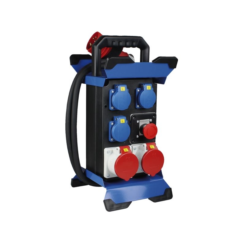 2m câble HO7 RNF 5G2.5 3 prises NF 1PNT/16A/250V 2 prises CEI 3PNT/16A/440V 1 bouton arrêt d'urgence 1 interrupteur différentiel 1 disjoncteur Coffret et prises protégés des chocs et de la boue (2 châssis métalliques) Puissance : 11 kW Indice de protection : IP44