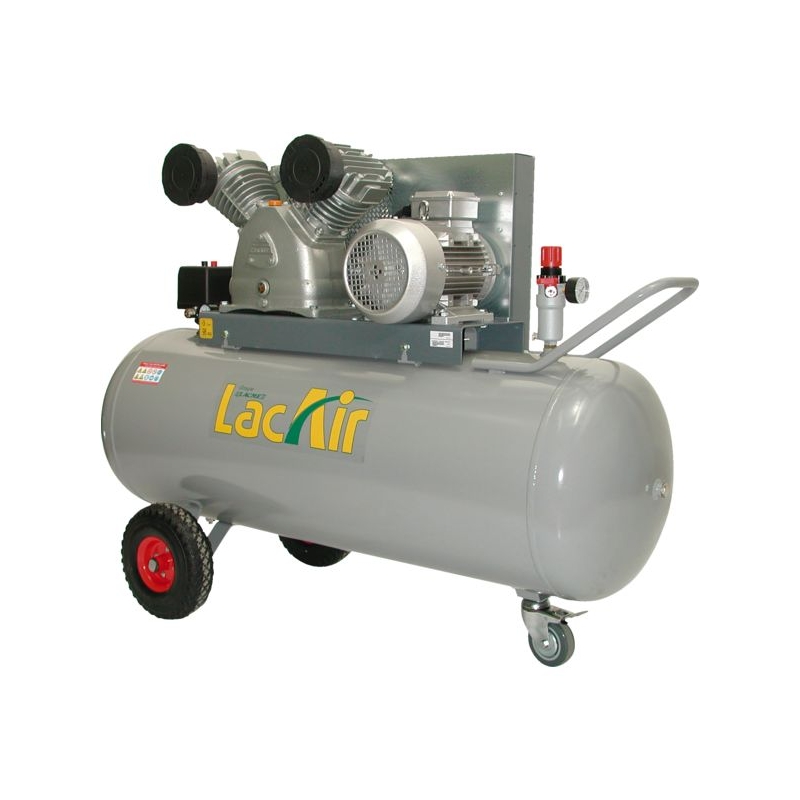Groupe fonte en V. Roues gonflables. Poignée de transport. Une roulette pivotante. Alimentation : 400 V triphasée Puissance : 5,5 cv Réservoir : 200 l Débit aspiré : 36 m³/h Débit restitué : 27,7 m³/h Pression maxi. : 10 bar Temps de charge à 10 bar : 3 mn 50 s Vitesse moteur : 960 tr/mn Poids : 131 kg Dimensions : 140 x 45 x 92 cm