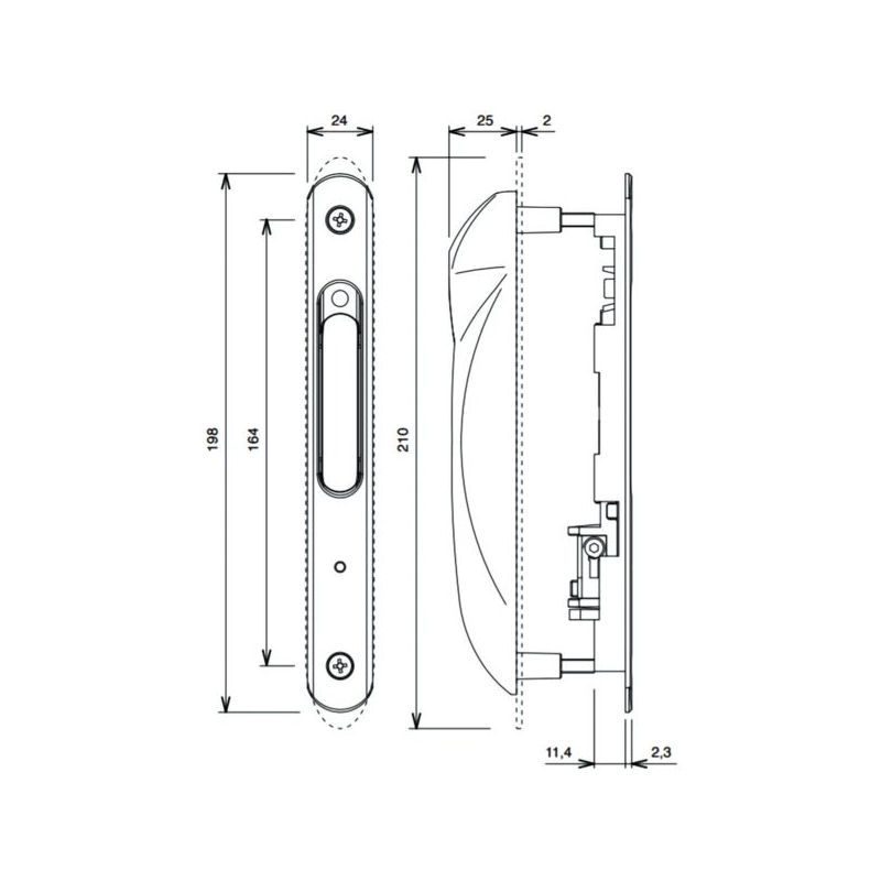 Ferrures adaptables pour plusieurs dimensions afin de répondre aux principaux cas de rénovation. Réglage bi-directionnel du crochet avec vis antidéréglage. Anti-crochetage de l'extérieur, blocage automatique de l'ensemble crochet en position fermée. Réglage du crochet en profondeur par clé 6 pans, course de 5 mm. Réglage latéral, course 6 mm. Kit composé de : - 1 coquille intérieure à condamnation par curseur, fournie avec 3 crochets de longueurs différentes selon distance à la gâche, - 1 poignée extérieure, - 4 paliers selon épaisseur du profil, - 2 longueurs de vis selon épaisseur du profil, - 1 platine intermédiaire, - 1 cylindre. Hauteur : 198 mm Entraxe de fixation : 164 mm Largeur : 24 mm Conditionnement : boite Conforme à la norme EN 13126.19