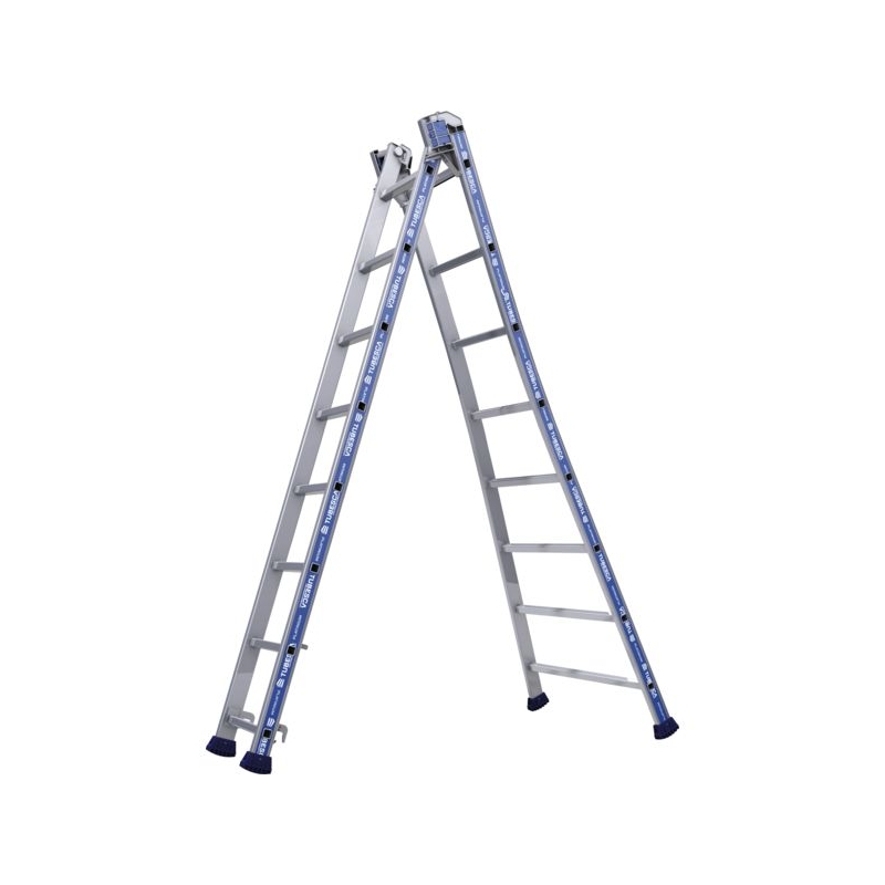 Utilisation sur sol plat ou dénivelé, usage ultra intensif. En aluminium. Échelons 30 x 30 mm. Articulation et montants renforcés. Glissière en aluminium avec patins de glissement intégrés. Base évasée pour une stabilité maximum. Sabots enveloppants avec témoin d'usure. Charge maxi : 150 kg Norme : NF - EN 131 - Décret 96 333