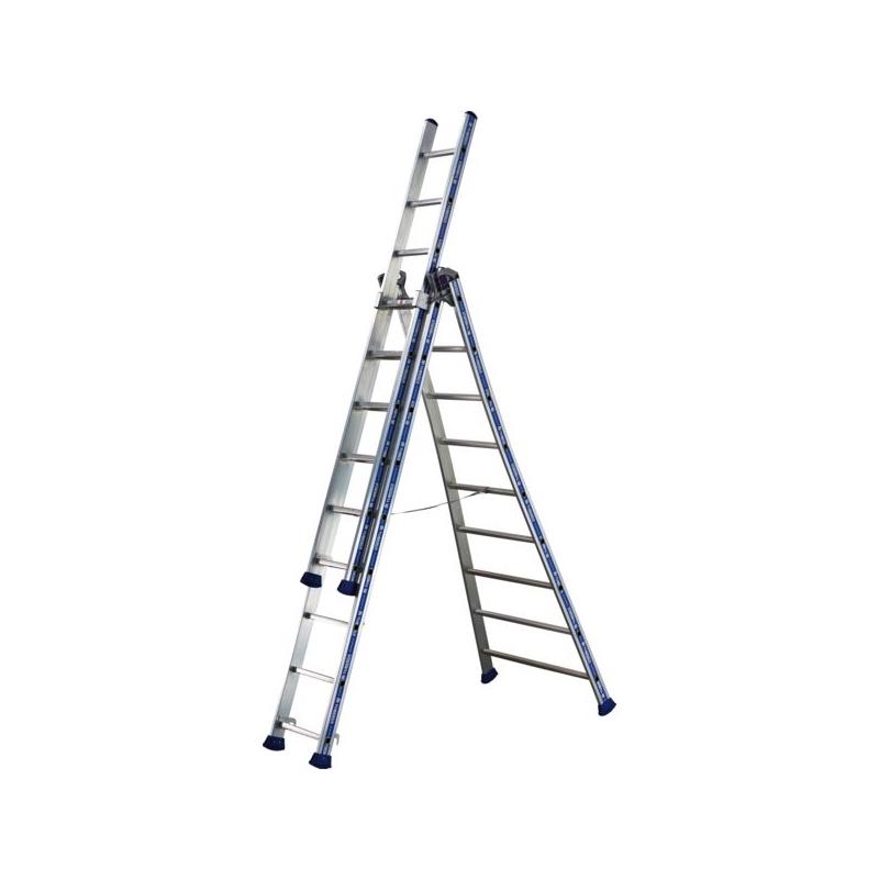 Utilisation sur sol plat ou dénivelé, usage ultra intensif. En aluminium. Échelons 30 x 30 mm. Articulation et montants renforcés. Glissière en aluminium avec patins de glissement intégrés. Base évasée pour une stabilité maximum. Sabots enveloppants avec témoin d'usure. Charge maxi : 150 kg Norme : NF - EN 131 - Décret 96 333
