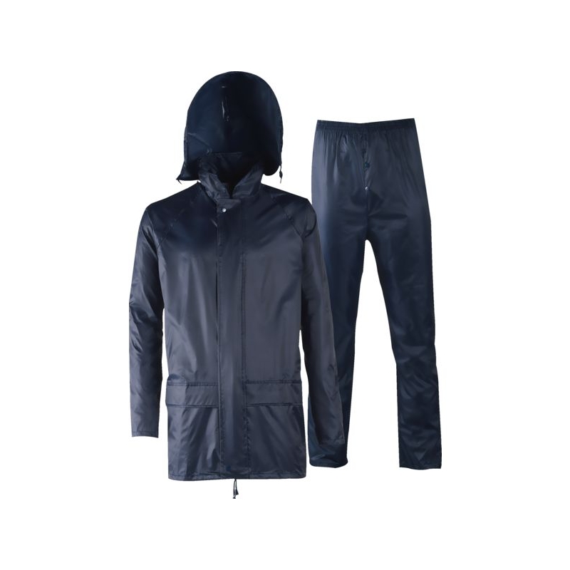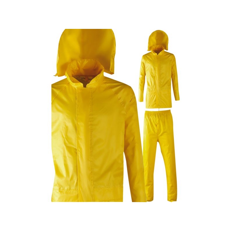 Polyester/PVC souple. Veste : capuche fixe et cordon de serrage, fermeture à glissière. Pantalon : serrage élastique à la taille. Coloris : bleu marine, jaune, vert Taille : M à 3XL