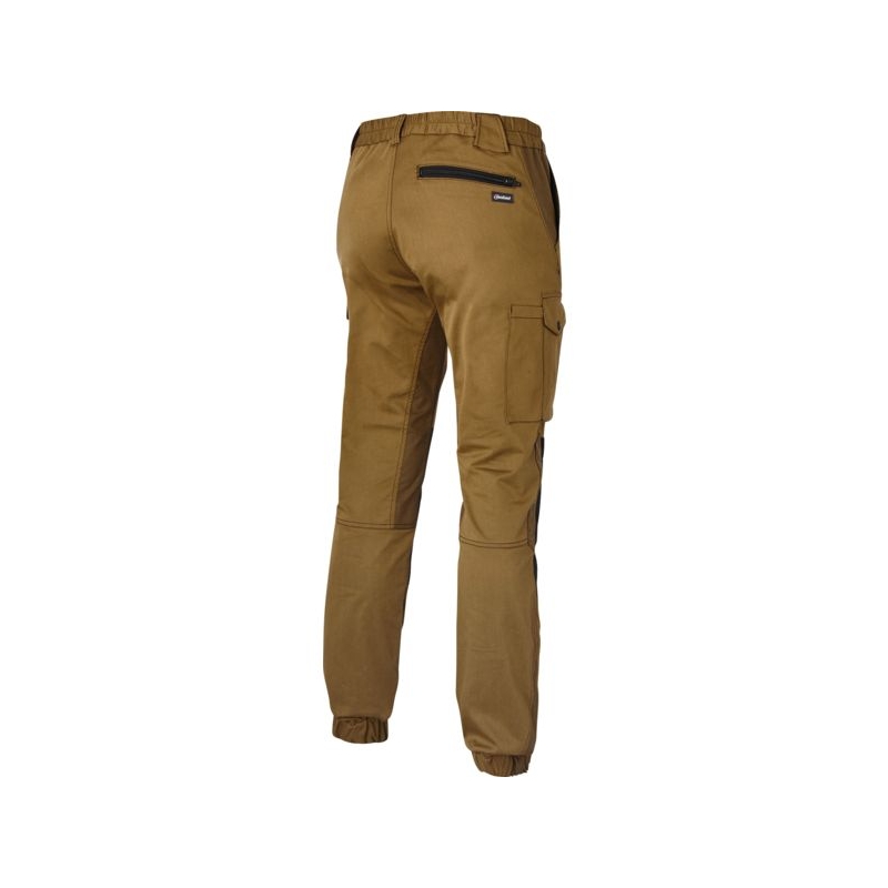 47% coton 35% polyester 18% polyamide, sergé stretch et Cordura®, 260 g/m². Ceinture élastiquée fermée par 1 bouton plastique. Dos couvre-rein. Braguette avec fermeture à glissière. Bas de jambe élastiqué. Renforts genou en Cordura. Poches italiennes, 1 poche passepoilée zippée dos, 2 poches cuisse plaquées avec compartiment stylo + encoche stylo à gauche et compartiment mètre à droite. Accroche clefs insérée sous la ceinture devant droit. Entrejambe 82 cm Coloris : camel, marine, gris, noir Taille : 38 à 52 Entretien : lavage industriel Norme : CE Cat I - EN ISO 15797