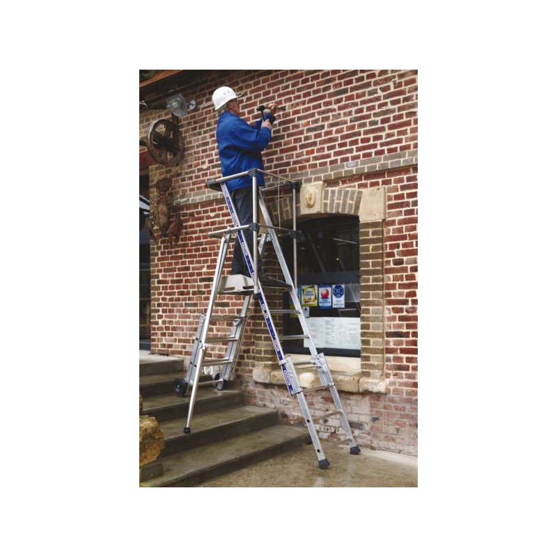 Utilisation sur sol plat et dénivelé. Usage ultra-intensif. En aluminium. Réglable en hauteur. Garde-corps 360° avec portillon semi-automatique rigide. Montants de 70 mm renforcés. Plate-forme 600 x 420 mm avec plinthes intégrées. Échelons striés antidérapants 30 x 30 mm. Tablette porte-outils intégrée. 2 roulettes Ø 160 mm pour les déplacements. Sabots antidérapants haute sécurité. Stabilisateurs réglables. Anneaux de grutage. Charge maxi. : 150 kg 3 à 4 marches : norme PIRL NFP 93353 - EN 131-7 - Décret 2004.924 5 à 11 marches : norme PIRL NFP 93352 - EN 131-7 - Décret 2004.924