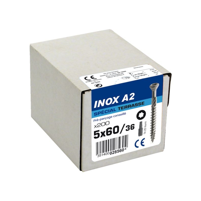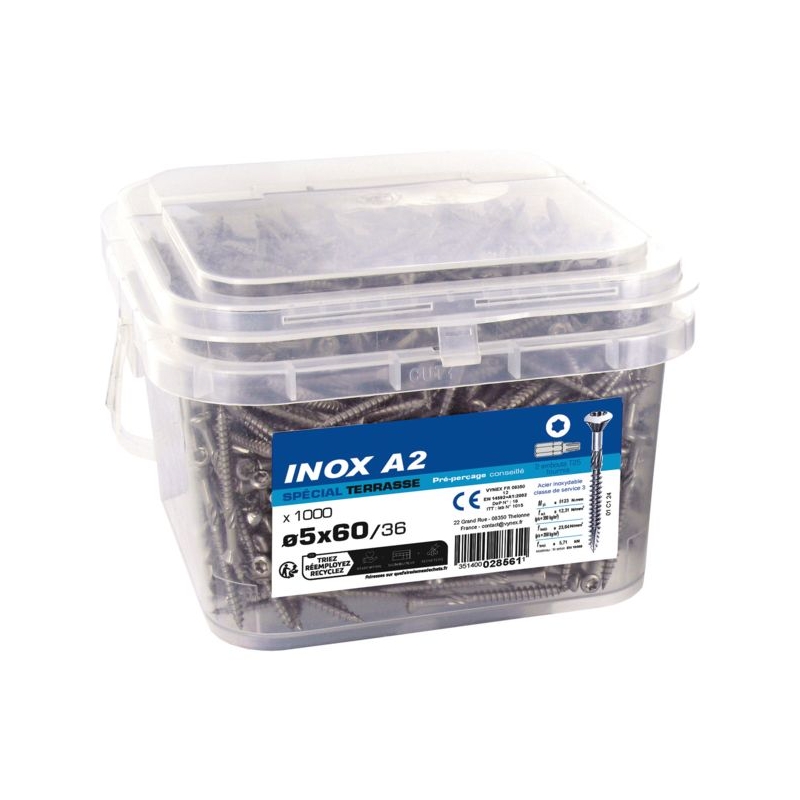 Idéale pour la pose de terrasses. Tête fraisée, empreinte Torx. Inox A2. Filetage partiel. Pré-perçage recommandé. Conforme au DTU 51.4 pose de terrasses bois et de lames de platelage. Seau de : 1000