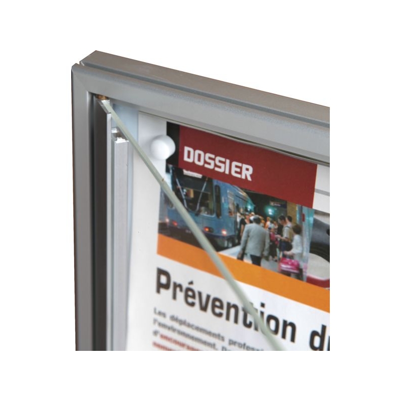 Porte battante, fermeture par serrure à clé avec pose à droite. Profil alu anodisé naturel, façade plexiglas avec entourage à partir du format 6 feuilles. Fond tôle blanc pour affichage magnétique. Fixation murale 4 points. Absence d'entourage de porte pour le format 4 feuilles. Épaisseur hors-tout : 20 mm Épaisseur utile : 12 mm